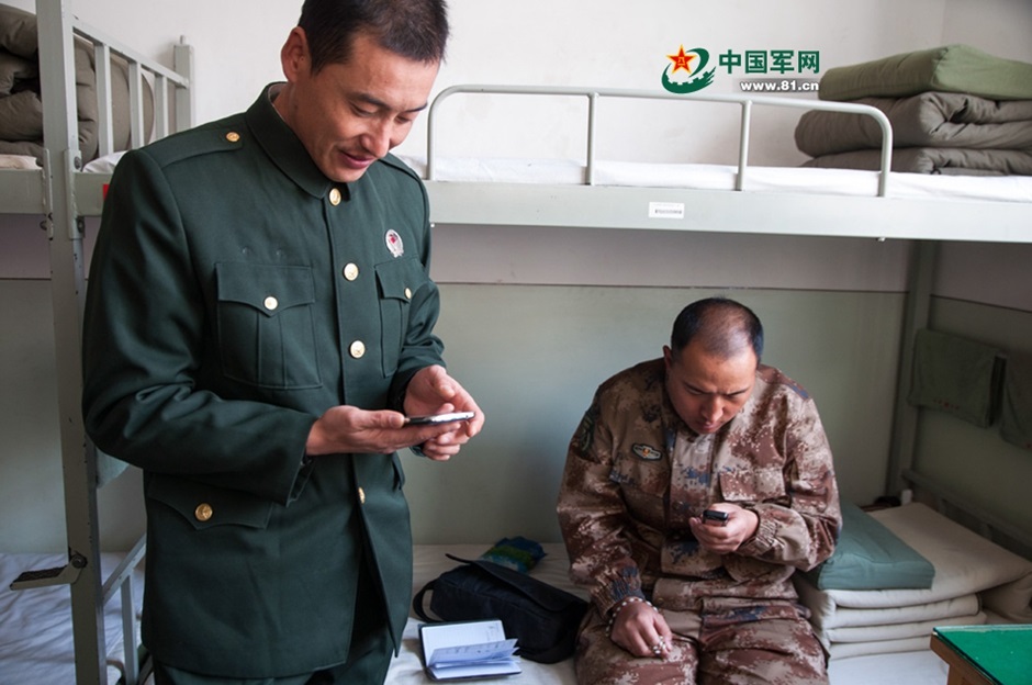 Su Mingming, from the 7th Tank Company comes over to say goodbye to Wu and they exchange their contact numbers. (81.cn/Cai Chuang)
