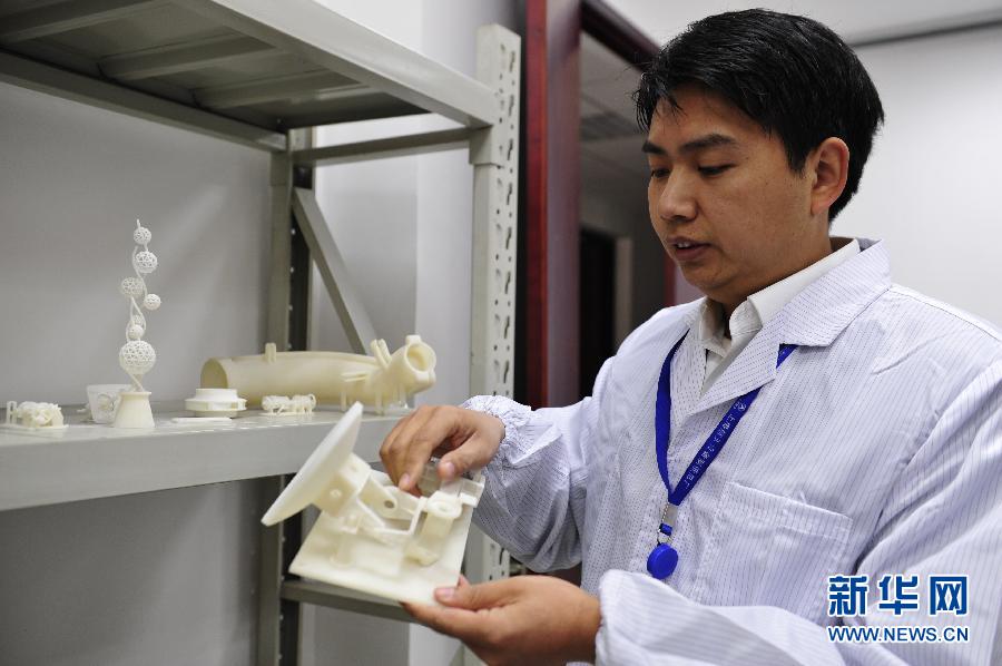 Wang Lianfeng, senior engineer at Shanghai Academy of Spaceflight Technology presents works by an aerospace 3D printer on Dec. 7, 2014. The academy has successfully developed a multi- laser metal 3D printer. In the future, astronauts can print all items with just one 3D printer in space. (Xinhua/Zhang Jiansong)
