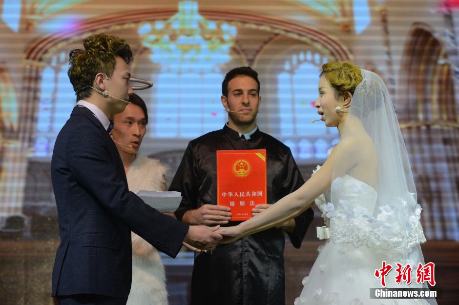A drama wedding is held in Taiyuan, north China's Shanxi on Dec. 7, 2014. The bride and the groom were the leading actor and actress in the drama. The plot of the drama is based on their love storyline from how they met to fell in love with each other. In China, post-90s couples are becoming the major consumers of wedding industry. They usually prefer more personalized wedding plans. (Chinanews/Wei Liang)