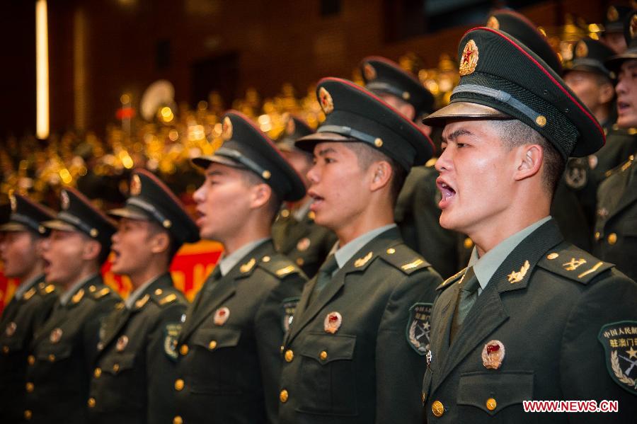 Soldiers attend the meeting to celebrate the 15th anniversary of the deployment in Macao of the Chinese People's Liberation Army (PLA) Garrison in Macao, south China, on Dec. 9, 2014. (Xinhua/Cheong Kam Ka)