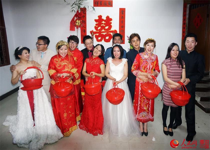| Six pairs of bride and grooms from Shanghai hold a traditional wedding ceremony with local characteristics. (Photo/People.cn) |