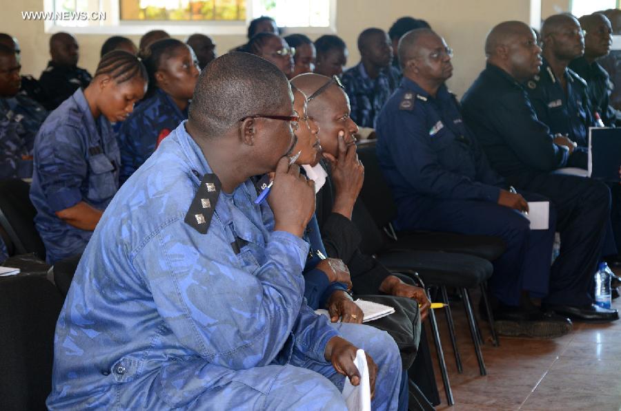 Sierra Leoean policemen learn how to protect themselves from Ebola disease during a training given by Chinese public health experts at the Police Club in Freetown, capital of Sierra Leone, on Dec. 10, 2014. Chinese public health trainers arrived in Freetown on Nov. 10 to give lessons to 500 local policemen in the next few days. (Xinhua/Cao Zheng)