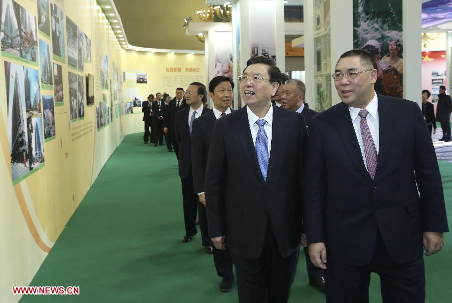 | Zhang Dejiang (L, Front), chairman of the Standing Committee of the China's National People's Congress, visits an exhibition on the development of Macao for the 15th anniversary of the Macao SAR's founding, in Beijing, capital of China, Dec. 8, 2014. (Xinhua/Pang Xinglei) |