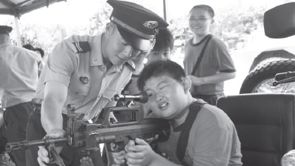 | A boy learns how to use a light machine gun under a soldier's guidance. More than 40,000 people have visited the PLA barracks since it began opening its doors to the public. Provided to China Daily |