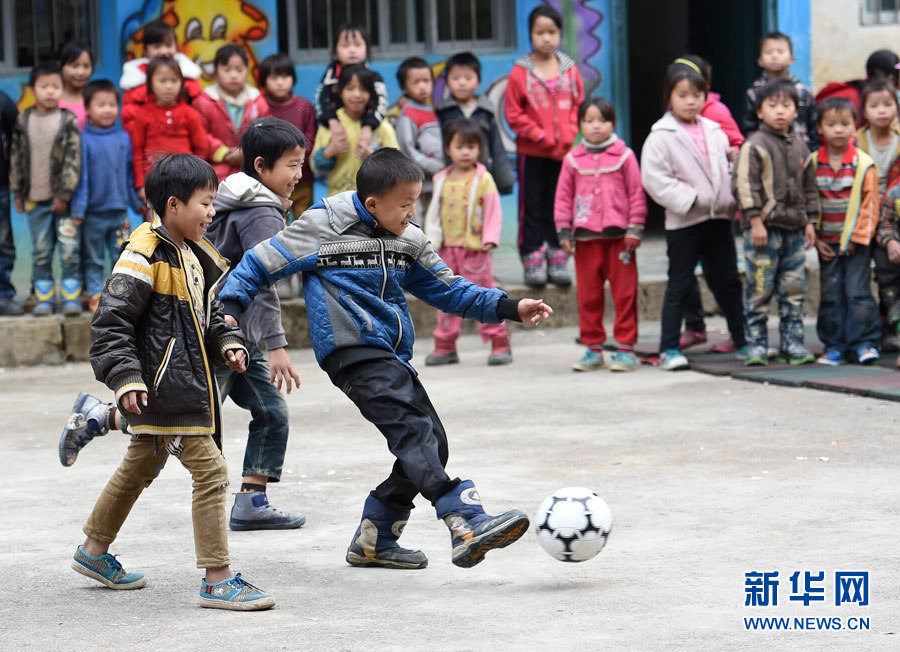 Students play football on the playground in a village in Dahua Yao Autonomous County in south China's Guangxi on Dec. 8, 2014. (Xinhua News Agency/Zhang Ailin)