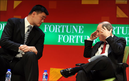 | The famous basketball player Yao Ming(L) talked with Fortune managing editor Andy Serwer on June 8, 2013.(Photo/People.cn) |