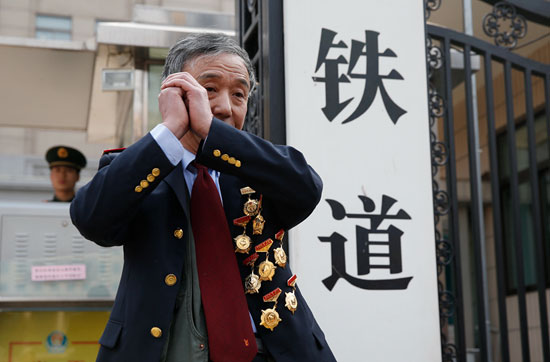 A model railway worker with medals on his chest posed for a photo at the entrance to the Ministry of Railways in Beijing, capital of China. China dismantled the Ministry of Railways in March, 2014.(Photo/People.cn)
