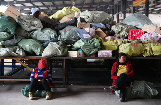 Three casual worker take a nap during the break at an express company.(Photo/People.cn)