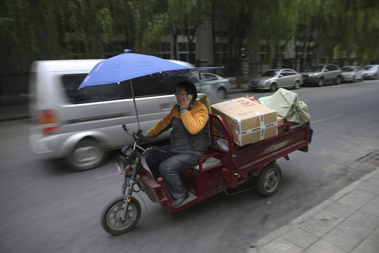 | An expressman riding a tricycle while talking with his client over the phone(Photo/People.cn) |
