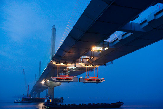 The last two steel box girders of Jiaxing-Shaoxing cross-sea bridge are lifted into place.(Photo/People.cn)