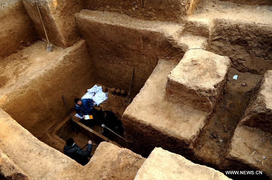 Archaeologists work in graves at the excavating spot of ancient relics of the Han Dynasty (202 BC-220 AD), in Wenxian County, central China's Henan Province, Dec. 11, 2014. (Xinhua/Zhu Xiang)