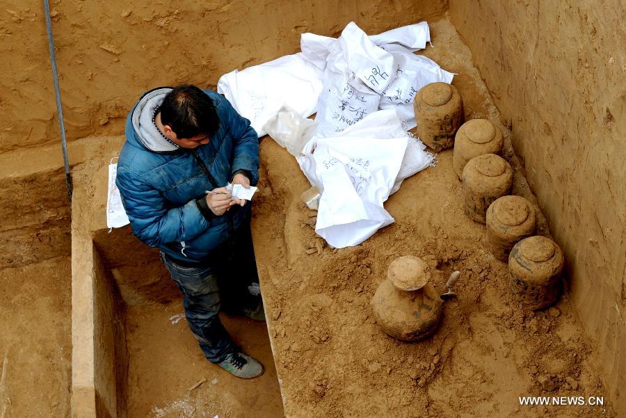 An archaeologist works in a grave at the excavating spot of ancient relics of the Han Dynasty (202 BC-220 AD), in Wenxian County, central China's Henan Province, Dec. 11, 2014. (Xinhua/Zhu Xiang)