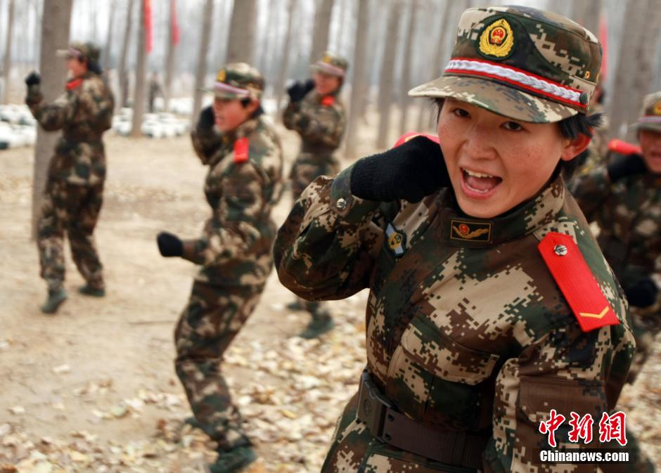 More than 3,000 new female recruits of Beijing Armed Police Force receive training in suburb of Beijing on Dec. 9, 2014. Training subjects include forced march, camping and military boxing in order to strengthen physical condition of the new recruits. (CNS/Yang Huifeng)