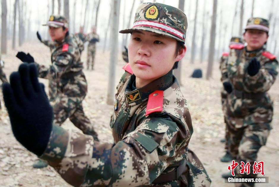 More than 3,000 new female recruits of Beijing Armed Police Force receive training in suburb of Beijing on Dec. 9, 2014. Training subjects include forced march, camping and military boxing in order to strengthen physical condition of the new recruits. (CNS/Yang Huifeng)