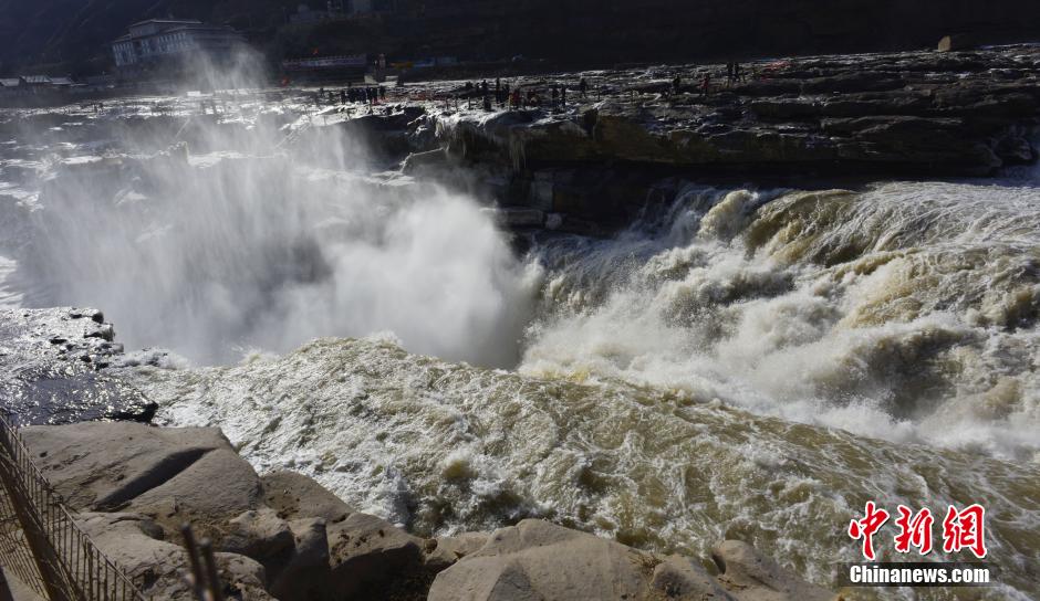 Silver thaw is formed along both sides of the Hukou waterfall of Huanghe River, north China's Shanxi province as temperature drops on Dec. 11, 2014. The spectacular scene of icefall and ice pillars attracted many tourists. (Chinanews/Rao Beicheng)
