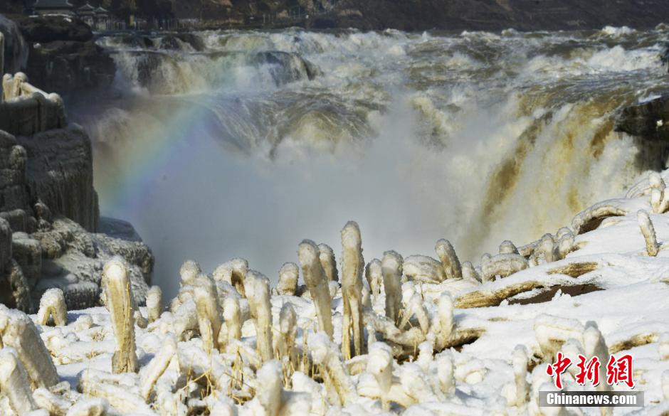 Silver thaw is formed along both sides of the Hukou waterfall of Huanghe River, north China's Shanxi province as temperature drops on Dec. 11, 2014. The spectacular scene of icefall and ice pillars attracted many tourists. (Chinanews/Rao Beicheng)
