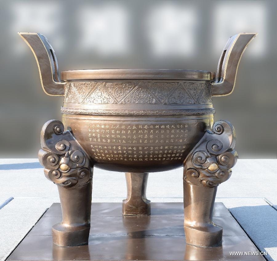 Photo taken on Dec. 13, 2014 shows the memorial "ding," a type of ancient Chinese cauldron symbolizing state power and prosperity, for the Nanjing Massacre victims at the state ceremony for China's first National Memorial Day for Nanjing Massacre Victims at the memorial hall for the massacre victims in Nanjing, east China's Jiangsu Province. Chinese President Xi Jinping, along with Xia Shuqin, an 85-year-old massacre survivor, and a school child, unveiled the "ding". (Xinhua/Ma Zhancheng)