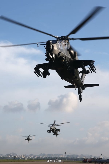 | Equipped with helicopters and light airplanes, the army aviation serves as a supportive force to ground forces. It is an important part of the modern army, responsible for destroying tanks, armored vehicles and military installations, aerial fire support, transporting troops and military materials as well as conducting aerial reconnaissance and electronic wars. (Photo source: official microblog account of PLA Daily) |