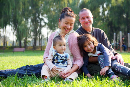 | Canadian Darren Moore and his Chinese wife, Zhang Ping pose for a photo with their children. The couple has cultivated their "green dream” in Beijing. (Photo/ Huang Ying) |