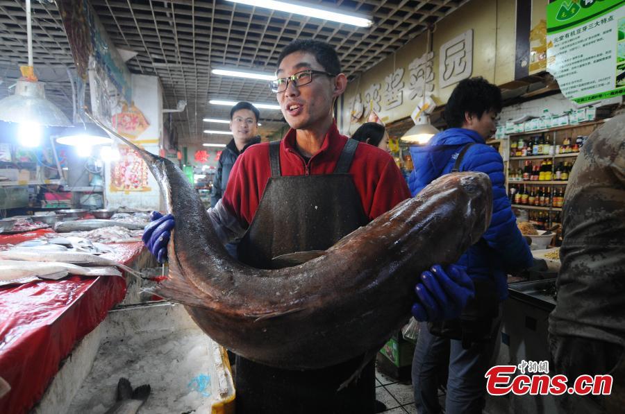 A man carries a 1.46-meter-long, over-50-kilogram unknown fish in a food market in Qingdao, East China's Shandong province, Dec 14, 2014. Fishermen in Jiaozhou, a county-level city in Qingdao, caught this big unknown fish along with a rare 10-kilogram flatfish in Bohai Gulf on the morning of Dec 12. [Photo: China News Service/ Wang Haibin]