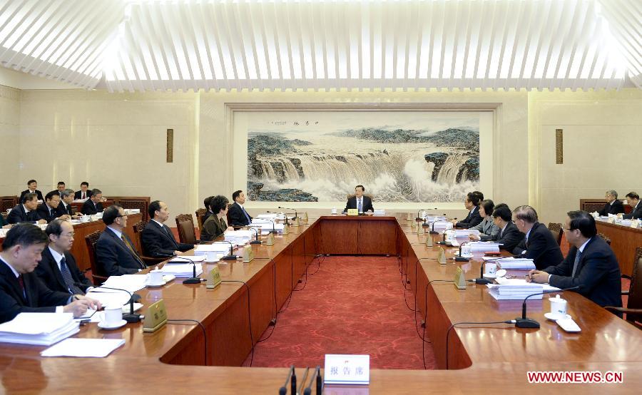 Zhang Dejiang (back), chairman of the Standing Committee of China's National People's Congress (NPC), presides over the 36th meeting of the NPC Standing Committee's chairman and vice chairpersons, at the Great Hall of the People in Beijing, capital of China, Dec. 15, 2014. (Xinhua/Zhang Duo)