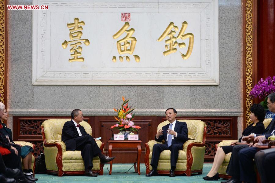 | Chinese State Councilor Yang Jiechi (3rd R) meets with representatives of overseas Chinese participants of the Symposium Commemorating the 35th Anniversary of the Establishment of China-US Diplomatic Relations, in Beijing, capital of China, Dec. 15, 2014. (Xinhua/Chen Yehua) |