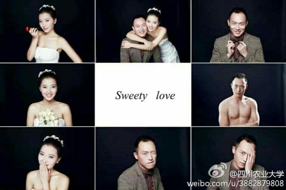 | Li Xu (male) and Tan Suyang (female) are two PE teachers at Sichuan Agricultural University. They got married in 2014 and the wedding photos show their sweet love towards each other. (Photo/Microblog of Sichuan Agricultural University) |