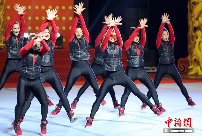 Photo taken on Dec. 14, 2014 shows college cheerleaders performing during the 2nd China Cheerleading Open Tournament at the gymnasium of Nanjing Tech University in Nanjing, east China's Jiangsu province. The competitors are 40 cheerleader teams from nine countries and regions including the US, Germany, South Korea and China. (Photo: China News Service/Yang Bo)