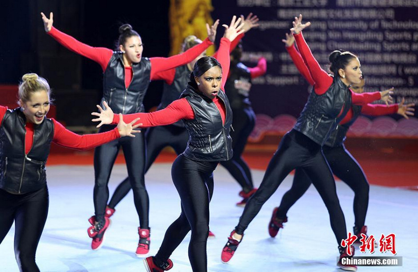 Photo taken on Dec. 14, 2014 shows college cheerleaders performing during the 2nd China Cheerleading Open Tournament at the gymnasium of Nanjing Tech University in Nanjing, east China's Jiangsu province. The competitors are 40 cheerleader teams from nine countries and regions including the US, Germany, South Korea and China. (Photo: China News Service/Yang Bo)