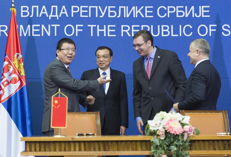 | Chinese Premier Li Keqiang (2nd L) and Serbian Prime Minister Aleksandar Vucic (2nd R) attend a signing ceremony after their talks in Belgrade, Serbia, Dec. 17, 2014. (Xinhua/Huang Jingwen) |