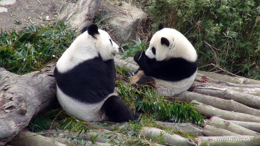 Giant panda cub Yuan Zai (R) and its mother Yuan Yuan eat bamboo at the Taipei Zoo in Taipei, southeast China's Taiwan, Dec. 18, 2014. The cub, born on July 6, 2013, has begun to learn how to live independently. It is the first baby of giant pandas Tuan Tuan and Yuan Yuan, which were given as goodwill gifts to Taiwan by the Chinese mainland. (Xinhua)