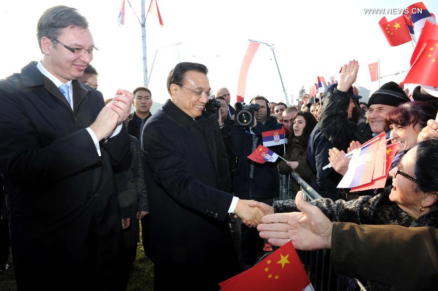 Chinese Premier Li Keqiang (C, front) shakes hands with local people as attending a ceremony marking the completion of a Chinese-built bridge across the River Danube together with Serbian Prime Minister Aleksandar Vucic (L, front) in Belgrade, Serbia, Dec. 18, 2014. (Xinhua/Rao Aimin)