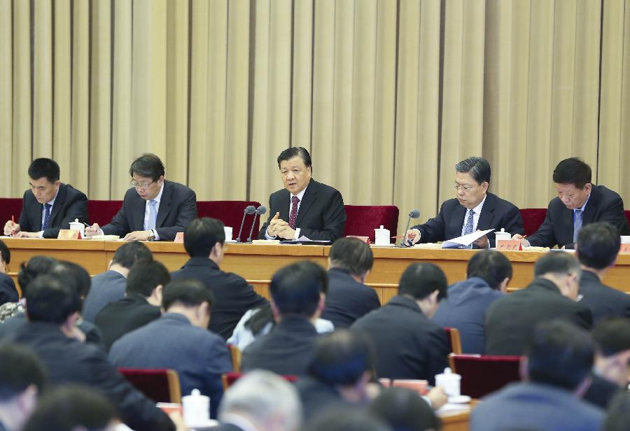 | Liu Yunshan (C), a member of the Standing Committee of the Political Bureau of the Communist Party of China (CPC) Central Committee, who is also a member of the Secretariat of the CPC Central Committee, speaks during a meeting of organization department heads of CPC Committees at all levels in Beijing, capital of China, Dec. 19, 2014. (Xinhua/Ding Lin) |