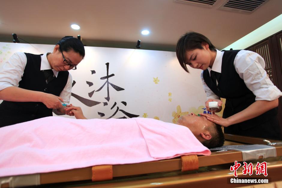 A special bathing ritual for a living man is held in Shanghai Longhua funeral parlor on Dec. 17, 2014. Usually the preparation of the body is done in front of family members and relatives. This time, encoffiners cleaned the body of “the departed”, washed his hair, put the dress on him and did make up. The special bathing ritual aims to guide the public to show respect to the deceased. (CNS/ Zhang Hengwei)