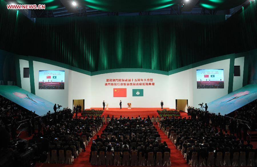 Administered by Chinese President Xi Jinping, Chui Sai On is sworn in as the fourth-term chief executive of the Macao Special Administrative Region (SAR) at a celebration gathering marking the 15th anniversary of Macao's return to the motherland in Macao, south China, Dec. 20, 2014. Chinese President Xi Jinping attended the celebration gathering and the inauguration of the fourth-term chief executive and government of the Macao SAR on Saturday morning. (Xinhua/Zhang Duo)