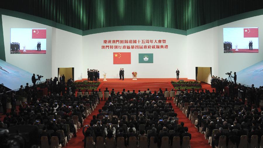 Led by Chui Sai On, the fourth-term chief executive of the Macao Special Administrative Region (SAR), and administered by Chinese President Xi Jinping, the principal officials of Macao's fourth-term government and the new prosecutor general of the Public Prosecutions Office are sworn in at a celebration gathering marking the 15th anniversary of Macao's return to the motherland in Macao, south China, Dec. 20, 2014. Chinese President Xi Jinping attended the celebration gathering and the inauguration of the fourth-term chief executive and government of the Macao SAR on Saturday morning. (Xinhua/Zhang Duo)