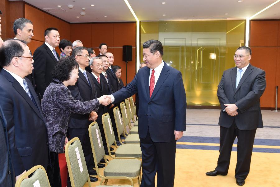 | Chinese President Xi Jinping (C) meets with heads of the administrative, the legislative and the judicial systems of the Macao Special Administrative Region during their meeting in south China's Macao, Dec. 19, 2014. (Xinhua/Liu Jiansheng) |