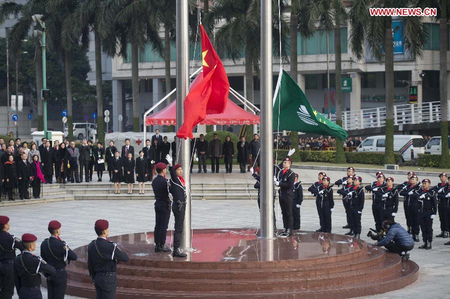 A flag-raising ceremony is held to celebrate the 15th anniversary of Macao's return to the motherland in Macao, south China, Dec. 20, 2014. (Xinhua/Lui Siu Wai)