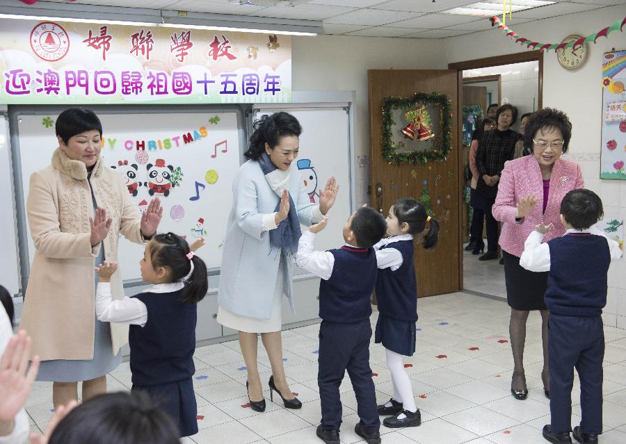 | Peng Liyuan (C), wife of Chinese President Xi Jinping, high-fives with two children as they listen to a folk rhyme during her visit to a kindergarten under the Women's General Association of Macao with the company of Fok Wai Fun (L), wife of Macao's Chief Executive Chui Sai On, in south China's Macao, Dec. 19, 2014. (Xinhua/Wang Ye) |