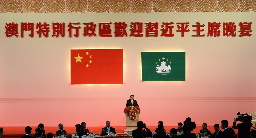Chinese President Xi Jinping attends a welcome banquet held by the Macao Special Administrative Region government to celebrate the 15th anniversary of Macao's return to the motherland in south China's Macao, Dec. 19, 2014. Xi Jinping delivered an important speech during the welcome banquet. (Xinhua/Qin Qing)