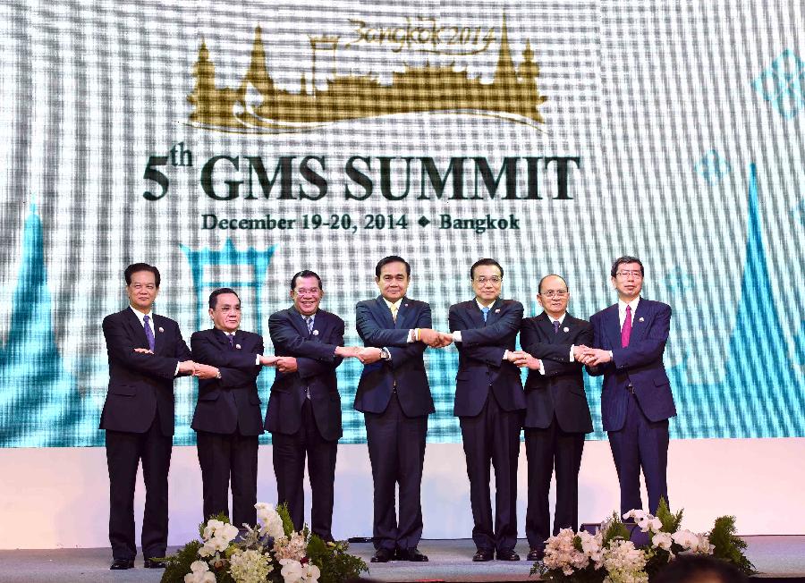 Chinese Premier Li Keqiang (3rd R) poses for a group photo with other regional leaders during the fifth summit of the Greater Mekong Subregion (GMS) Economic Cooperation in Bangkok, Thailand, Dec. 20, 2014. (Xinhua/Rao Aimin)