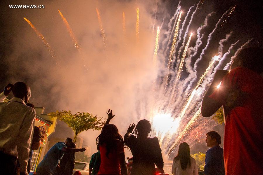 Zimbabweans cheer as fireworks blast in the sky in Harare, Zimbabwe, Dec. 22, 2014. The Chinese Federation of Zimbabwe on Monday organized a Christmas party themed "We are together" in western suburbs of Harare to bring Zimbabweans and Chinese together in celebrating the Christmas holiday that begins this week. (Xinhua/Xu Lingui)