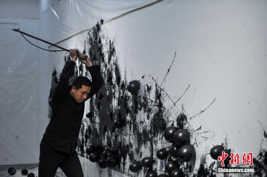 Naxi artists He Libin uses a whip to break the balloons filled with ink hanging on the canvas to complete his artwork "Autumn Scene at the riverside of Fuchun River" at an exhibition in Kunming, southwest China's Yunnan province on Dec. 20, 2014, which has attracted people's attention. (CNS/Ren Dong)