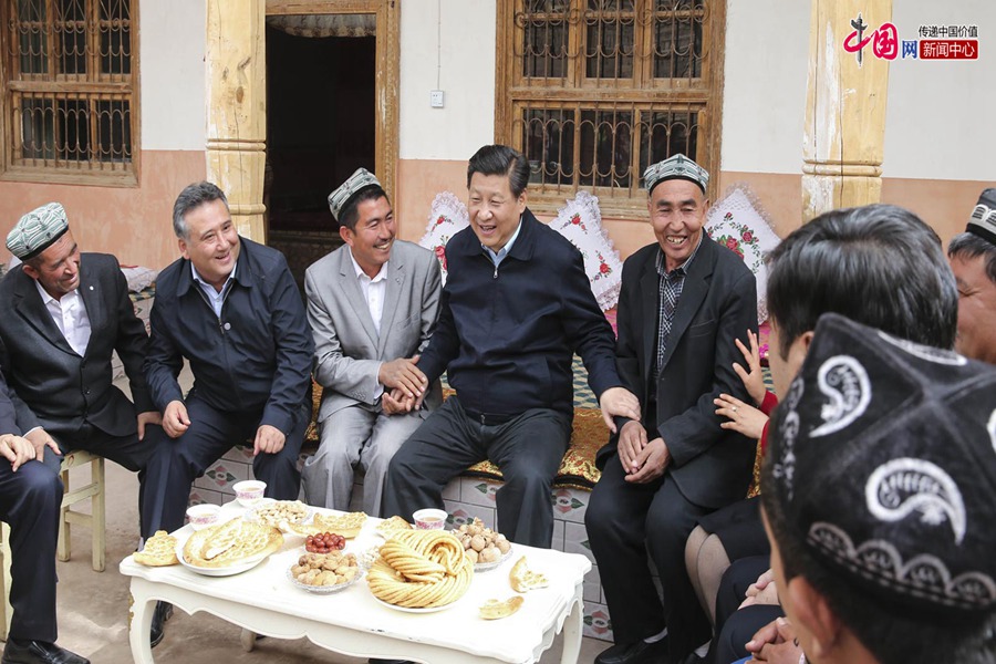 On April 28, 2014, President Xi visits Shufu county, Xinjiang Uygur autonomous region. Together with the villagers, he recalled the beautiful stories of the educated youth who made contribution to the Xinjiang production and construction corps in 1960s and 1970s. (Photo/China.com.cn)