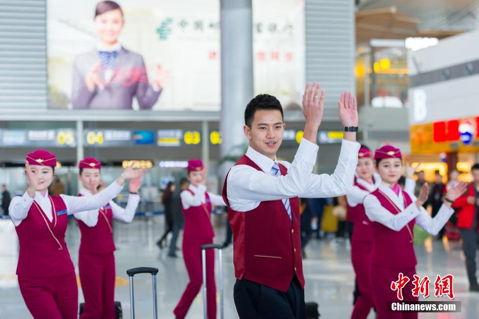 26 flight attendants perform flash mob in Longdongbao Airport Terminal in Guiyang, capital of southwest China's Guizhou province to welcome the upcoming new year on Dec. 22, 2014. (CNS/He Junyi)