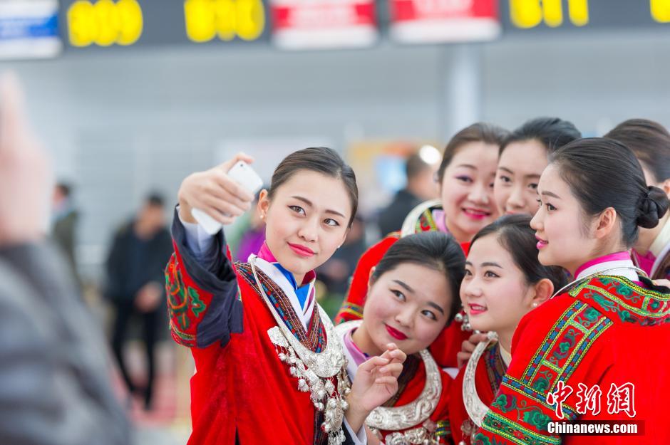 26 flight attendants perform flash mob in Longdongbao Airport Terminal in Guiyang, capital of southwest China's Guizhou province to welcome the upcoming new year on Dec. 22, 2014. (CNS/He Junyi)