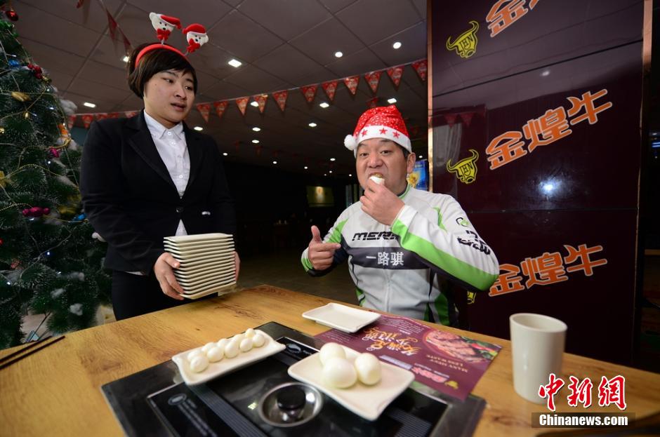 Pan Yizhong takes part in a Christmas challenge and eats up 150 boiled quail eggs and 10 boiled chicken eggs in 37 minutes. (CNS/Yang Huafeng)