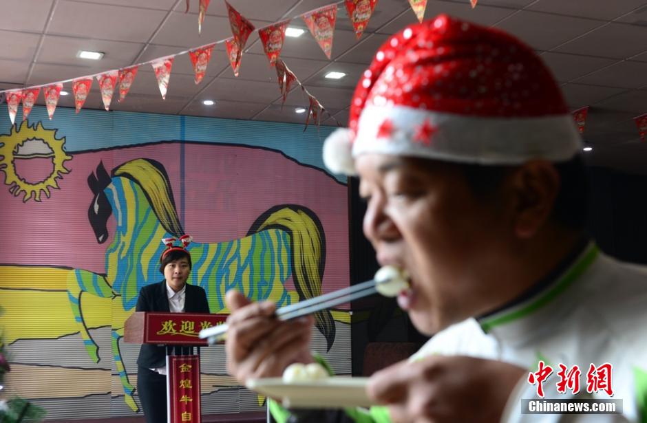 | Pan Yizhong takes part in a Christmas challenge and eats up 150 boiled quail eggs and 10 boiled chicken eggs in 37 minutes. (CNS/Yang Huafeng) |