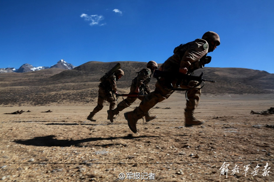 A battalion successfully conducted a tactical drill at the foot of Mount Tanggula in Tibet on Dec. 20, 2014. It’s a great challenge for soldiers to complete missions in the severe cold of a 5000-meter-high plateau. (Official microblog of PLA Daily)