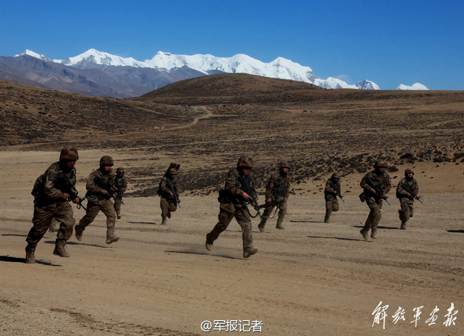 A battalion successfully conducted a tactical drill at the foot of Mount Tanggula in Tibet on Dec. 20, 2014. It’s a great challenge for soldiers to complete missions in the severe cold of a 5000-meter-high plateau. (Official microblog of PLA Daily)